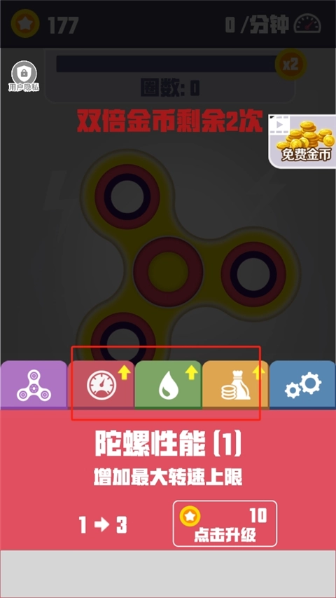 3、也可以用金币升级陀螺,提升他的性能、润滑度等数值,让他变的更加持久