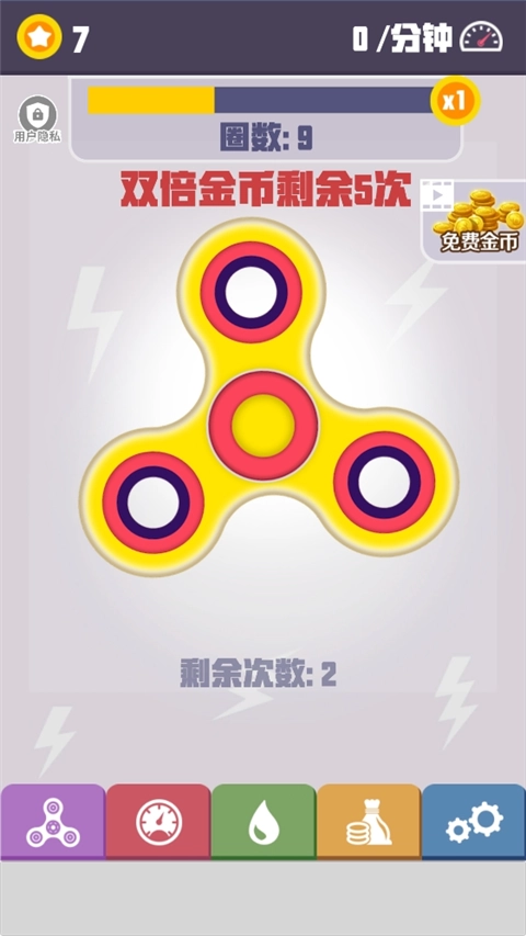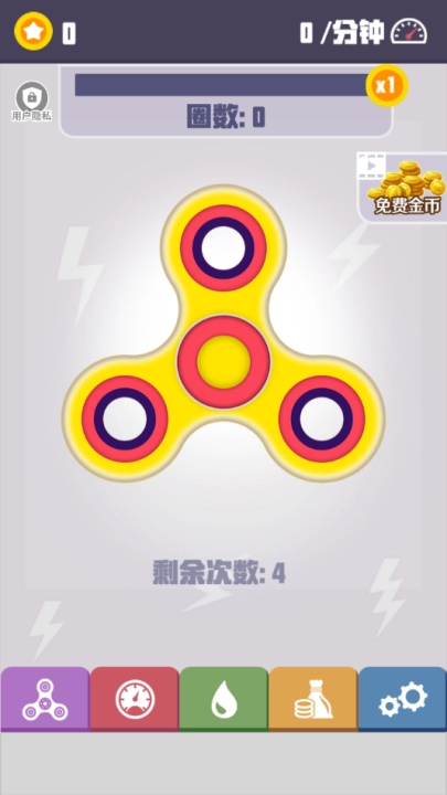 2、达成上方的圈数要求即可获得金币,点击右下角的陀螺图标可以解锁更多的指尖陀螺样式