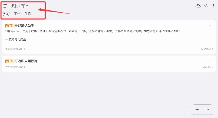 1. 应用启动后,于知识库模块能够挑选学习、工作、生活等主题分类来浏览内容。