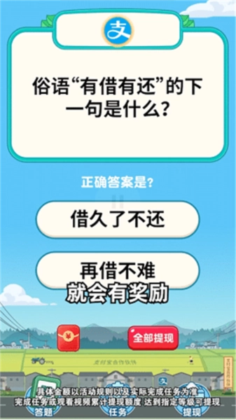 1在开心答题宝中,答对越多成语,就能拿到越多红包,这可是实实在在能领红包的游戏。