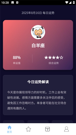 2、首页会根据当前日期显示本月星座的运势,还带有详细的今日运势解读;