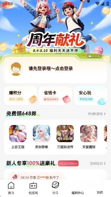 个人中心与积分体系功能:支持登录后管理我的游戏、礼包、代金券等资产,查看充值返利记录;通过完成任务赚取积分,积分可在积分商城兑换平台币,平台币可用于游戏充值或兑换福利,形成“任务-积分-福利”的激励闭环。