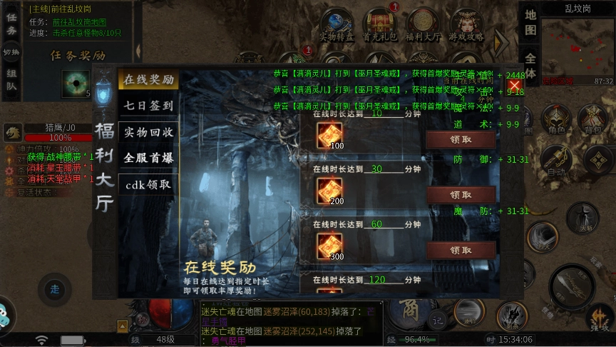 3、灵符获取:途径多样,包括怪物掉落实物回收、参与游戏活动、回收打怪爆出的稀有装备、首爆奖励、完成特殊剧情(可获大量真充奖励)。日常多参与活动、积极刷怪,提高灵符获取量。