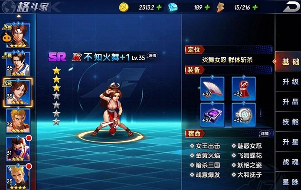喜欢打特效技能的旁友可以尝试走一波灼烧流,需要的英雄有舞,草薙京,草薙菜舟,李烈火,八神和酒鬼。