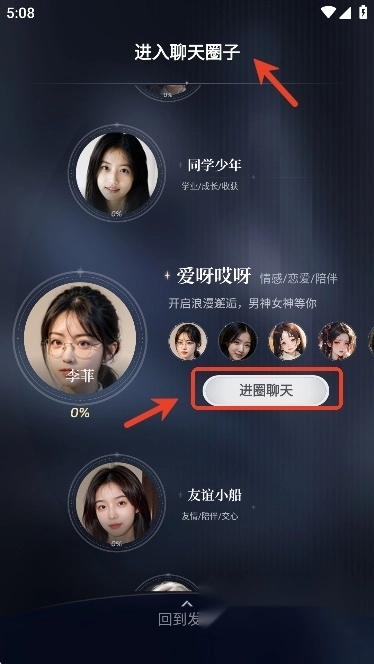 用户们可以选择自己喜欢的虚拟聊天圈子,然后点击“进圈聊天”