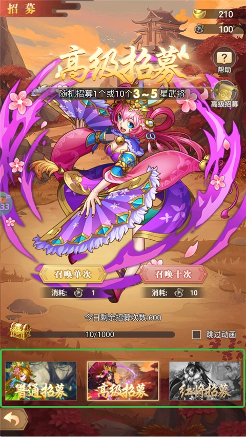 1、玩家只要踏入酒楼,就能召唤名将,招募分为普通、高级、红将这三种等级。