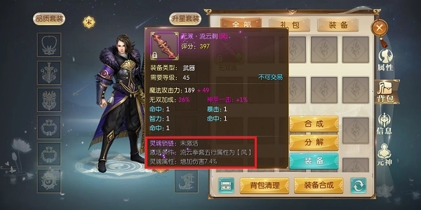五行和灵魂品质是紫色装备独有的高阶属性。通过紫色装备合成可以获得装备五行属性,灵魂品质以及灵魂锁链。