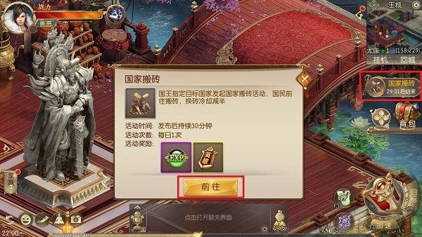 先前往本国太庙,点击雕像后选择国家,然后选择组队或者独自搬砖,前往敌国太庙后进行搬砖和换砖操作,完成后回到本国太庙交付任务,领取奖励。每日仅有前三次搬砖任务有奖励。
