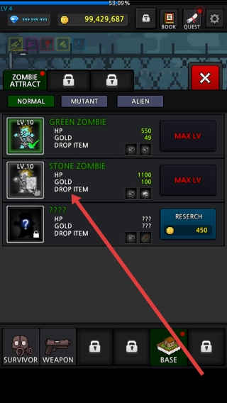 2、进入僵尸图鉴,查看“STONE-ZOMBIE”属性,可花费金币(450)研究,提升对其伤害或掉落收益。