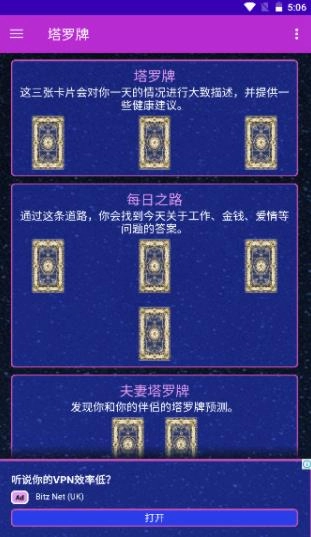 2、进入塔罗页面,可以查看塔罗牌介绍,并按照分类预测需要的信息。