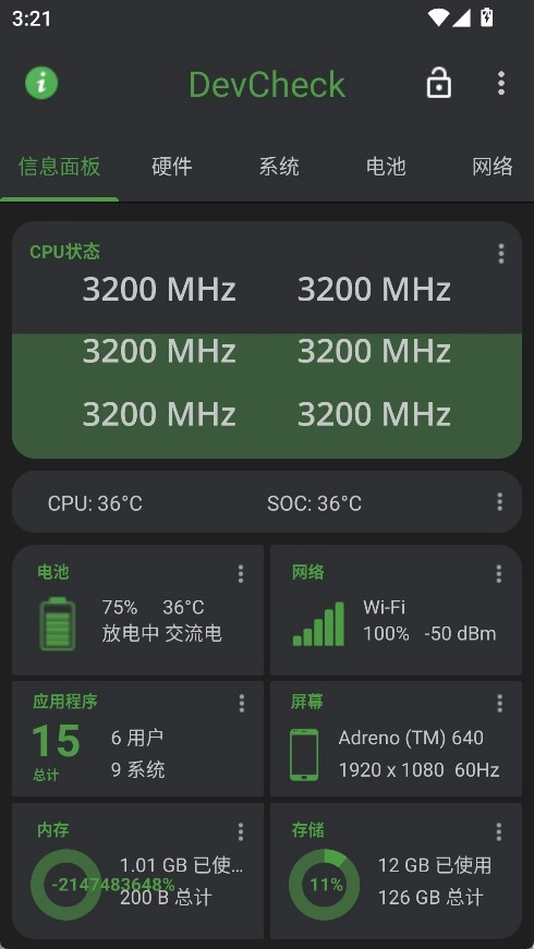 2、信息面板显示CPU状态、CPU负载、电池状态、网络情况(包括上传速度),运行内存大小,手机存储空间大小。