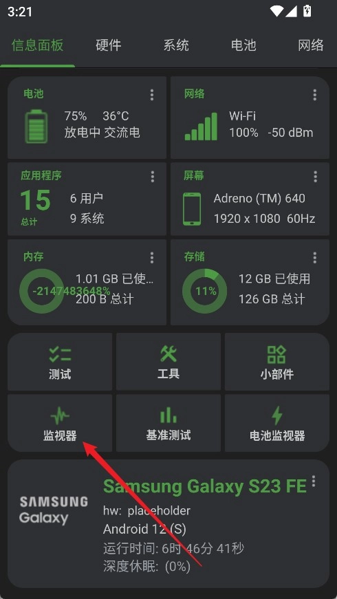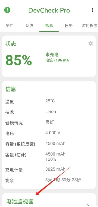 2、在这个页面你可以查看你手机的电池信息,然后点击下方的电池监视器