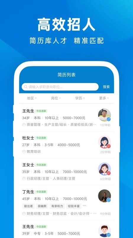 平台拥有丰富的简历库人才资源,企业能够快速精准匹配,随意预览简历列表,高效招聘到合适的人才,实现快捷招人。