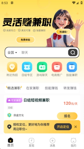 1. 首页具备附近热招、日结专区、游戏聊天、电商推广以及技能兼职等功能。