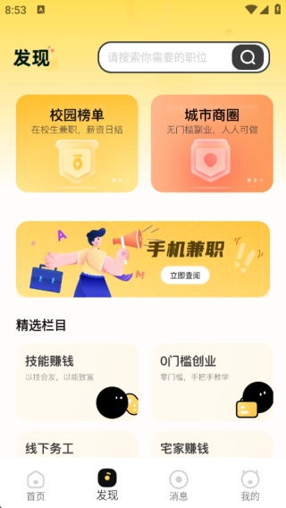 2、在发现页面中可以了解校园榜单、城市商圈、手机兼职,同时还有各种精选栏目;