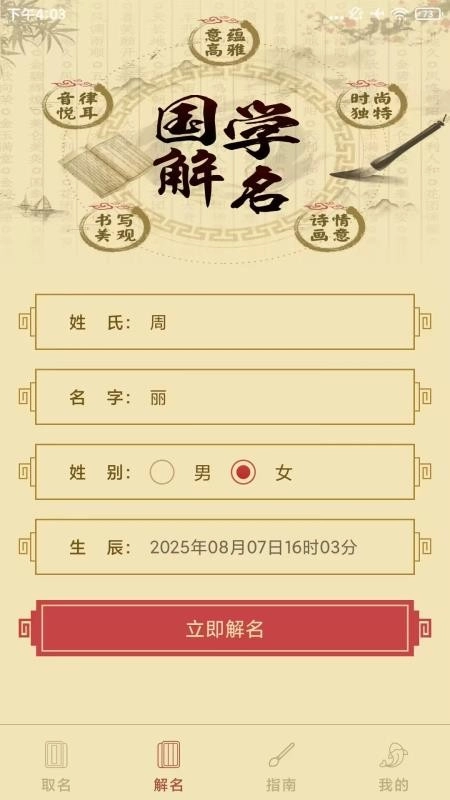 软件提供了线上的国学起名,能够对名字的书写美观、文化内涵等进行起名,实现传统国学起名。