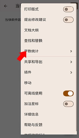 3. 于弹出的下拉菜单里选择字数统计选项。