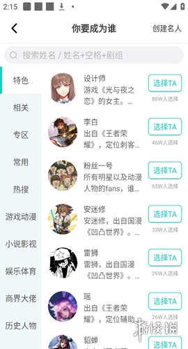 3、在切换身份界面中,浏览提供的众多名人身份,找到想要扮演的角色,点击“选择TA”,即可成功切换身份,开始新的社交体验。