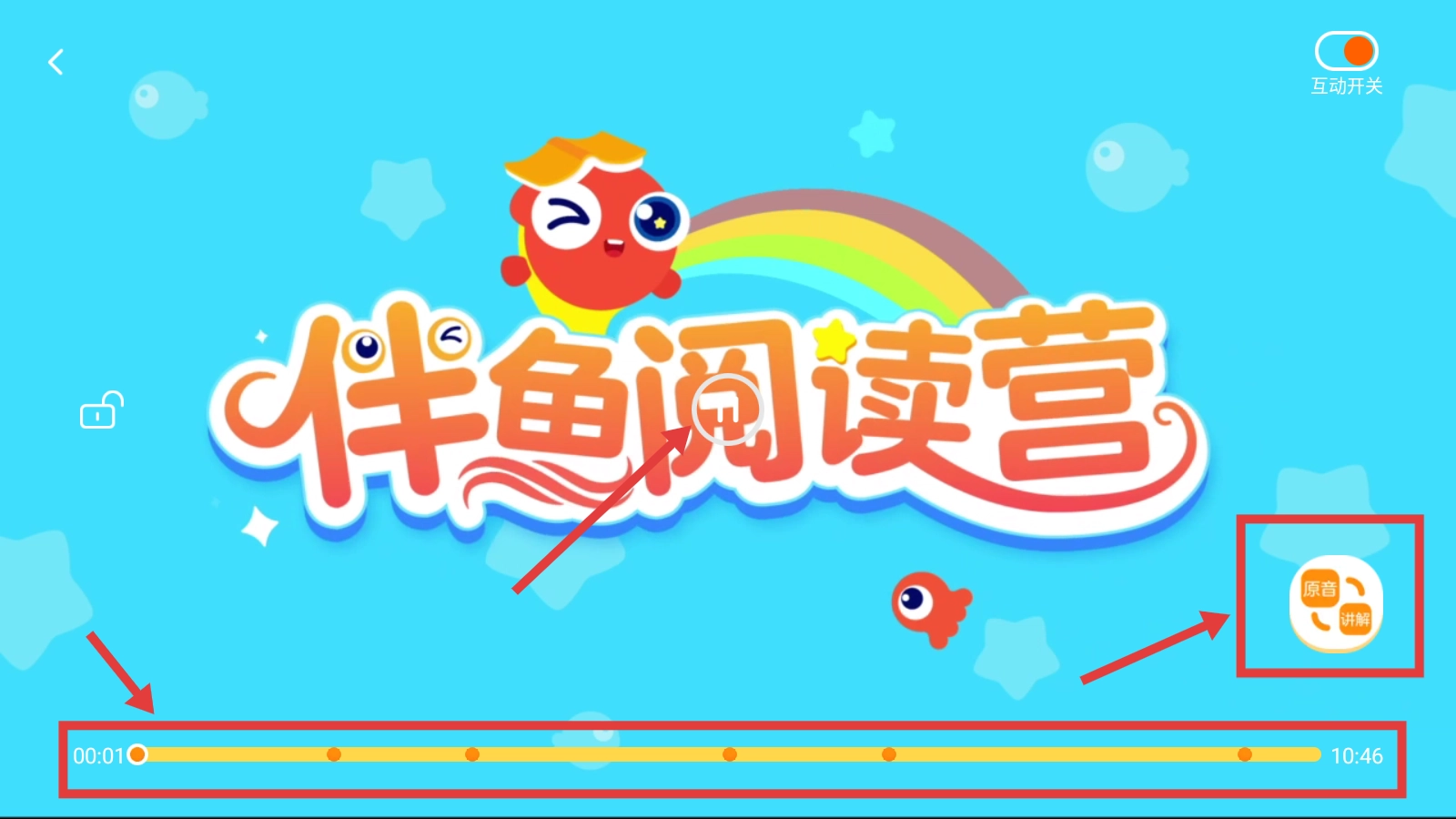 4、播放页可【查看进度条】,如果需要【也可开启互动与原声讲解功能】。
