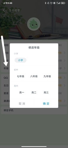 2、来到个人信息界面,可以看到很多可以进行设置的信息,其中就有【年级】的选项,点击这个选项,重新选择我们的年级即可