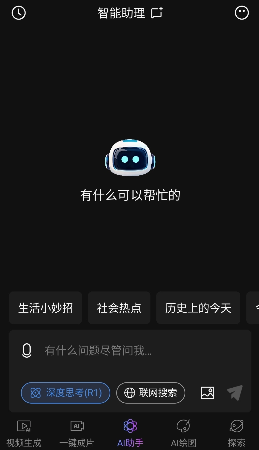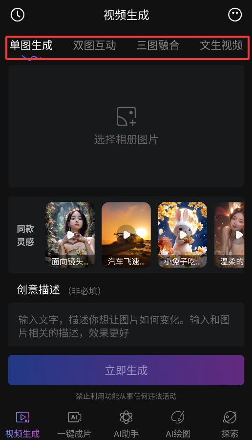 2、"智能生成"支持单图转视频、多图动态融合及文字描述生成视频(输入200字内创意文案)。