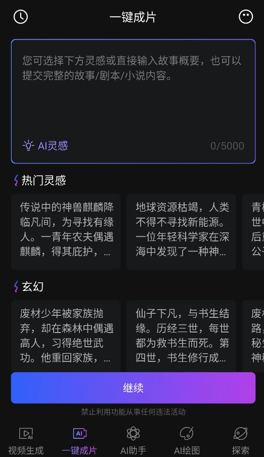 3、"剧本创作"可提交完整故事大纲,AI自动分镜并生成1-3分钟短视频,支持灵感关键词触发。
