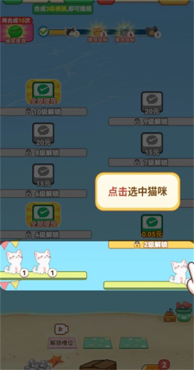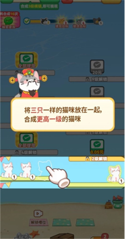 2、将三个一样的猫咪放在一起,合成更高一级的猫咪。