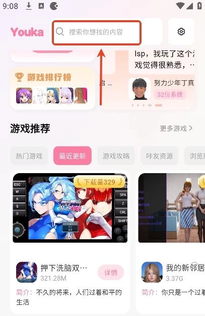 1、打开,用户们可以在首页搜索栏搜索自己想要找寻的游戏名称或者相关游戏攻略。