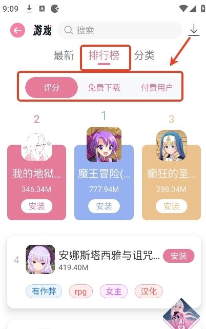 2、用户们可以根据游戏排行来挑选自己喜欢类型的游戏并安装,有评分榜,免费榜和付费榜。
