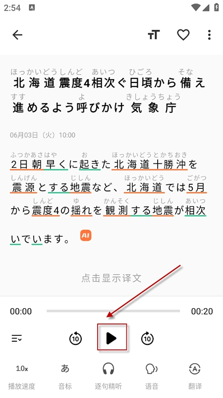 3.点击文章内“语音”按钮,选择语速和发音人;开启“循环播放”,跟读句子,观察单词高亮顺序强化记忆