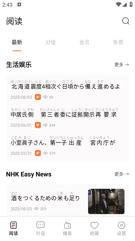 2.在阅读页面选择文章,浏览日文原文,下方自动显示中文翻译,点击下划线单词查看词典解释