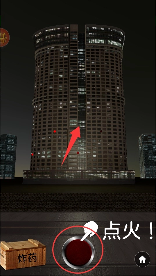 2、通过滑动调整炸药安放角度,确认位置后点击引燃按钮,注意把握引爆时机确保连锁爆破效果。