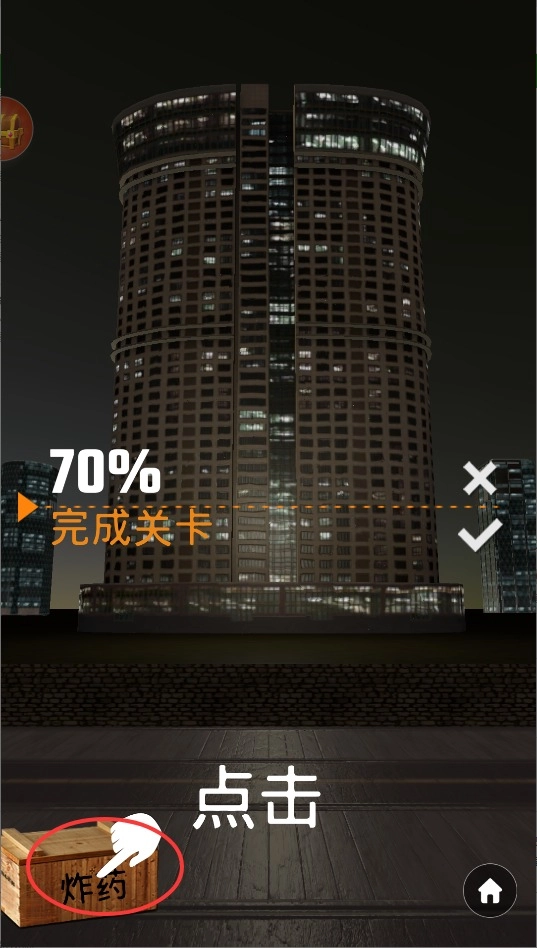 1. 进入关卡后,先点击选择炸药包,接着仔细观察建筑结构,从中找出关键支撑点,随后把炸药放置在能够造成最大破坏的位置。