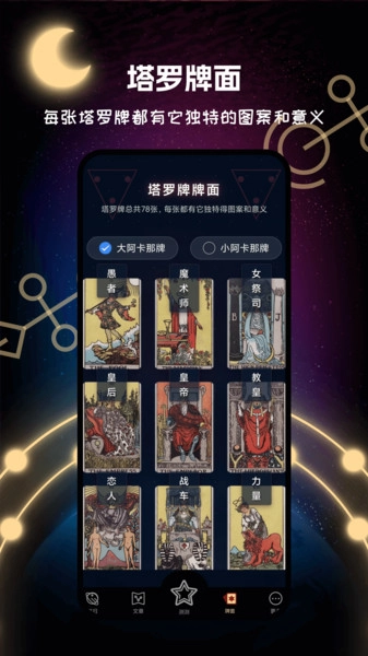 2、丰富的塔罗牌知识库,包括塔罗牌的历史、起源、各牌面的象征意义、牌阵的构成与解读技巧等,用户可以在占卜之余学习塔罗牌。