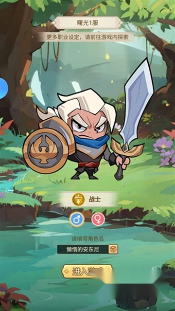1、玩家进入游戏后,需先完成实名认证,接着挑选游戏区服。当前游戏仅设有战士这一角色,玩家设定好名字与性别后,点击“进入游戏”,就能踏入希望大陆。