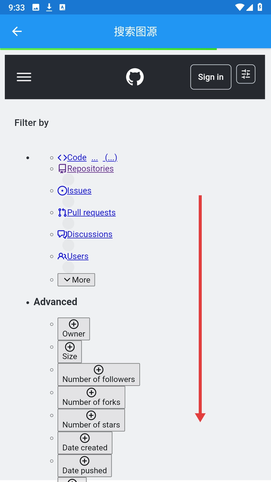 2、进入搜索页,【下滑屏幕】查找想要的图源。