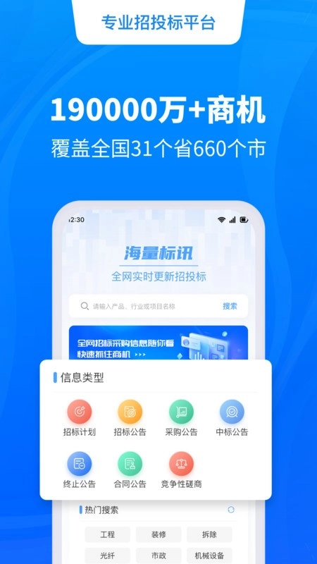 覆盖全国范围内的招标信息,及时提供政府采购、土地拍卖、建设工程、设备采购等全行业招标信息