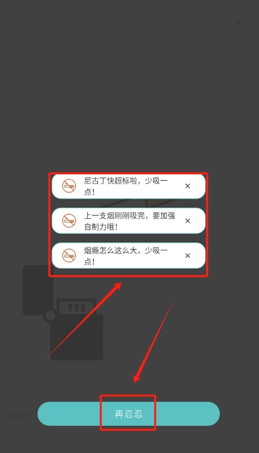 2、弹出三个提醒抽烟危害的警示牌,把警示牌关掉后,再点击 “再忍忍” 按钮。