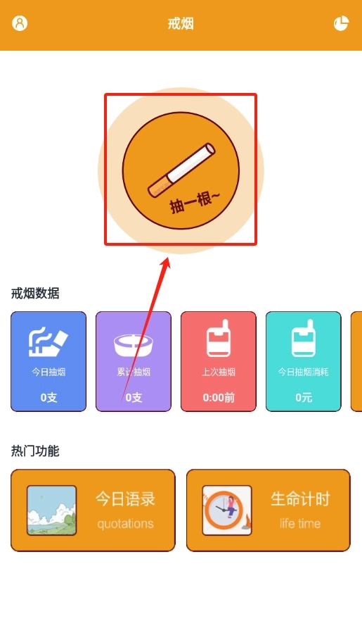 1. 开启福轮今日戒烟打卡软件,若有抽烟想法,径直点击界面中的“抽一根”按钮。