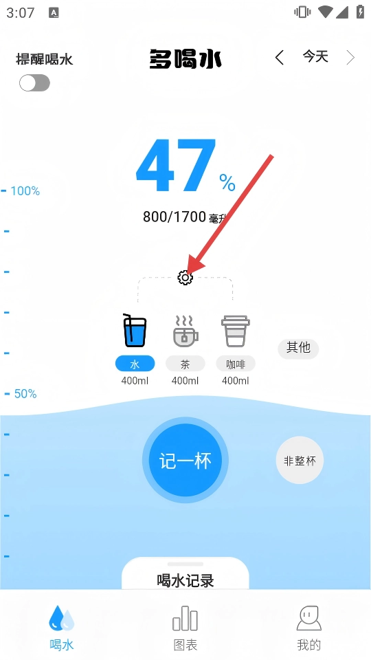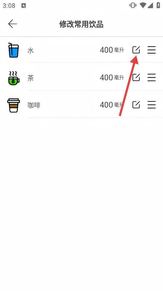 2、首页点水量下方的设置按钮,进入【修改常用饮品】,开启饮品编辑。
