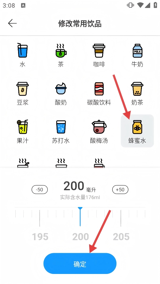 4、选【蜂蜜水】设200毫升,点【确定】,更新常用饮品配置。