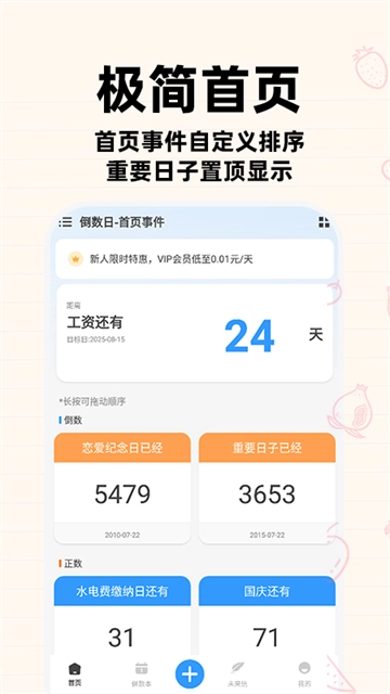 倒数计时日,一款简洁又高效的日期管理利器,助你轻松铭记每一个关键日子。无论是生日、纪念日,亦或是考试倒计时、还款提醒等,它都能实现智能提醒,确保你不会错过生活里的任何精彩瞬间。再配上精美的桌面小组件,重要日期即刻清晰呈现!