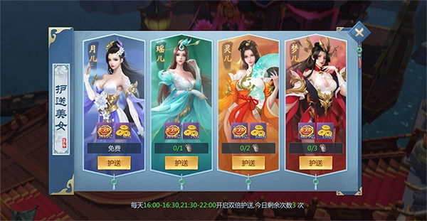 玩家每日可参与3次,根据拥有的护花令数量选择要护送的美女,越高级的美女护送成功可获得的经验越高,每天16:00-16:30、21:30-22:00开启双倍护送,收益更高!