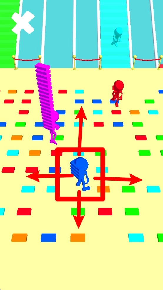 2.角色控制方式:通过拖动屏幕控制角色移动方向,灵活走位以收集与自己颜色一致的砖块并搭建通道。