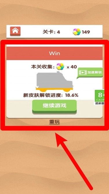 3. 结算并继续游戏:通关后会展示收集结果以及解锁进度,点击“继续游戏”,就能进入下一关,或者选择重新游玩当前关卡。