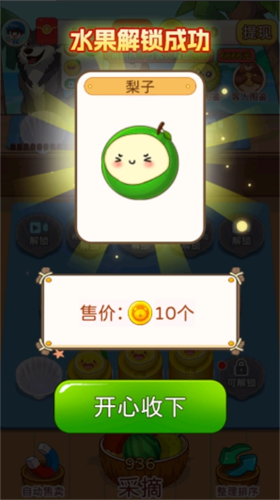3、不断的完成订单还会解锁新的水果,获得金币哦。