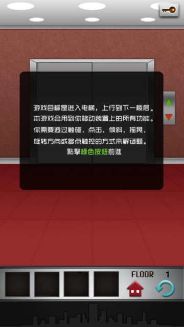 1、第一层:按下电梯旁的绿色按钮,待门打开后,点击地面上的绿色箭头,即可进入下一层。