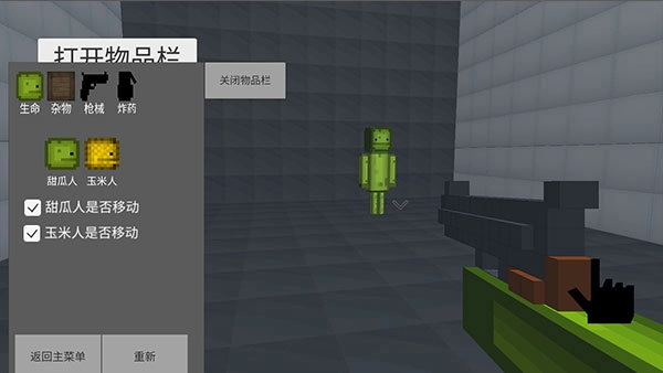 3、进入地图后,点击打开物品栏,玩家可以添加甜瓜人、玉米人、桌子,以及装备手枪、放置炸药等。