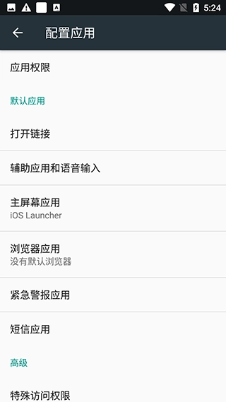 5、点击“主屏幕应用”,默认是我们的系统选项“launcher3”,选择设置“ioslauncher16”为默认应用。