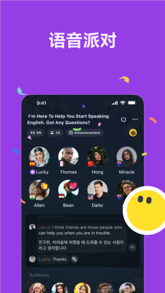 - 语聊派对:能随时进入语音房间,与母语者以及其他学习者展开实时交流,在轻松氛围中提升口语能力。无论是探讨日常话题,还是进行文化交流,都能营造自然的语言环境,尤其适合那些不擅长面对面交流的用户。